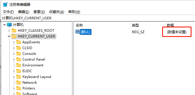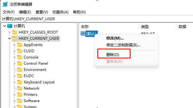 第3步:点击HKEY_CURRENT_USER,在右侧的默认字符串值右键-删除